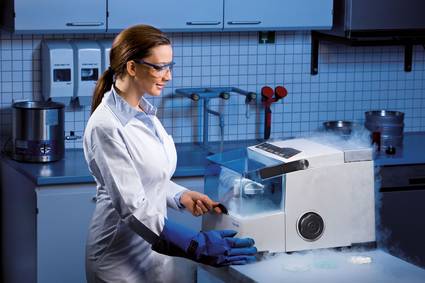 CryoMill была специально разработана для измельчения проб при низких температурах. Размольный стакан непрерывно охлаждается жидким азотом из встроенной охлаждающей системы до и во время процесса измельчения. Таким образом образец охрупчивается и все летучие компоненты сохраняются.