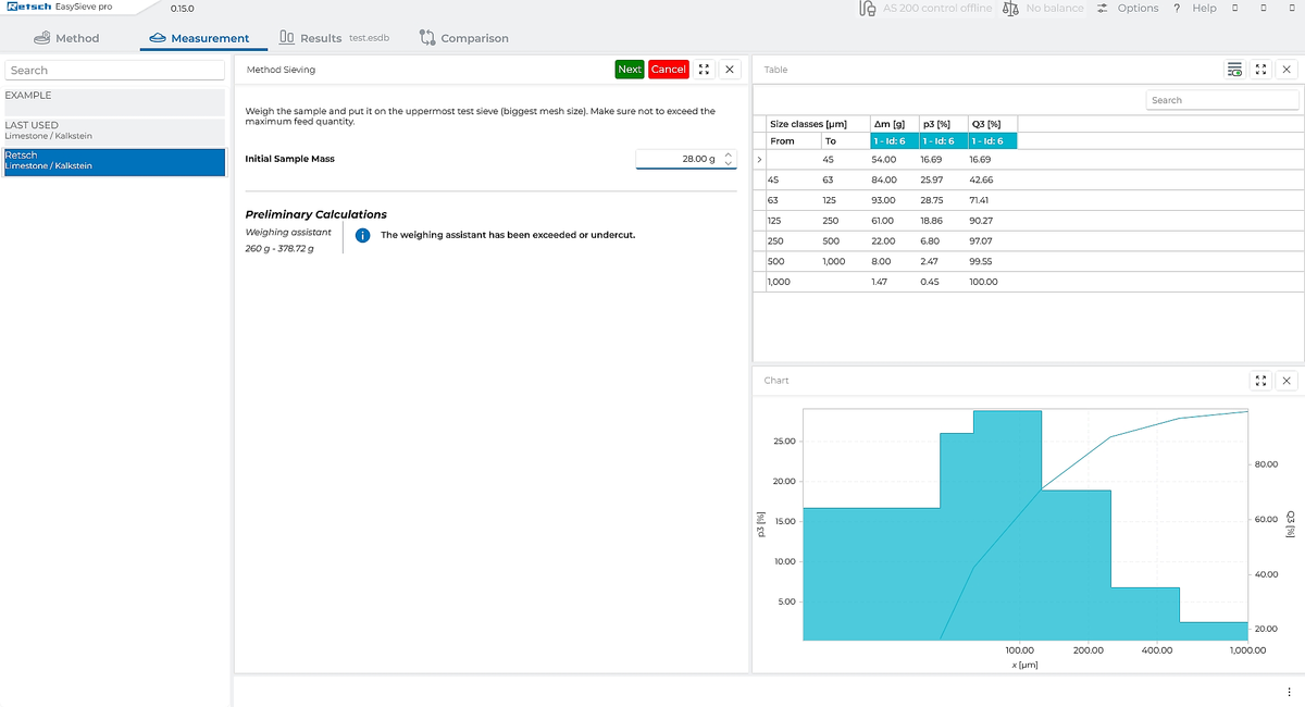 Be sure to use RETSCH sieves to benefit from our newly developed Weighing Assistant, which directly recommends the optimal sieve load. This helps you avoid incorrect results due to overloading or underloading and saves you unnecessary repetitions. A familiar problem: Different sample materials make correct loading a challenge. EasySieve pro | pharma takes this worry away from you – after entering the sample bulk density, the system shows you the optimal weighing range. Your sieving becomes reproducible and reliable.
